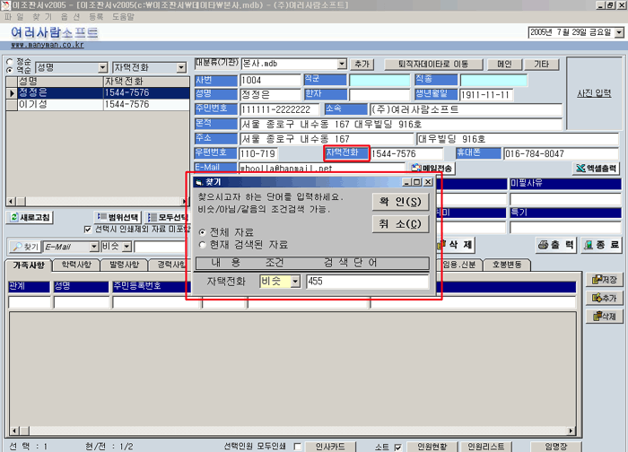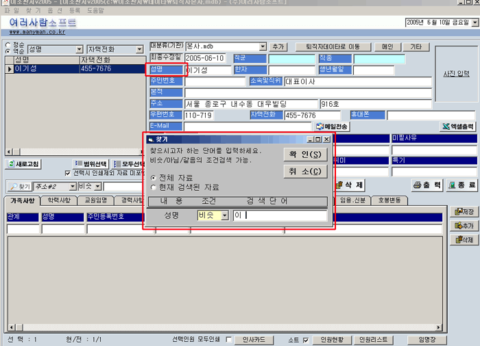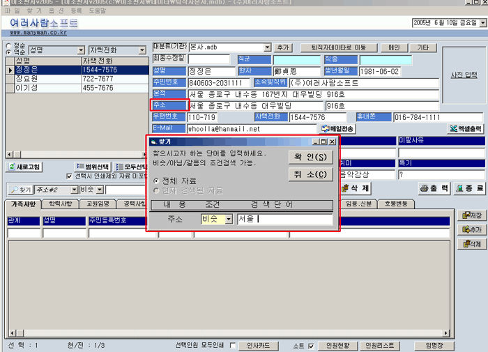 ¿¹) ÁÖ¼Ò¿¡ "¼­¿ï", ÀüÈ­¿¡ "455", À̸§¿¡ "ÀÌ"ÀÚ°¡ Æ÷ÇÔµÈ »ç¶÷ ã±â